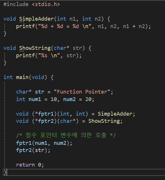 해당 코드를 보면 함수 포인터 변수를 어떻게 만드는지, 또 어떻게 사용하는지에 대한 내용이 나온다.