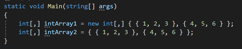 자바와는 다르게 다차원 배열의 경우는 아래와 같은 형태로 선언이 가능하다.