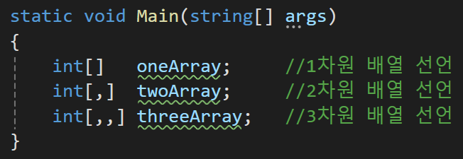 데이터타입[,,] 배열이름; //3차원 배열 선언
