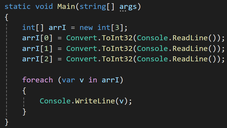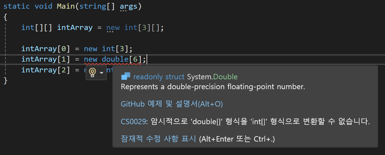 배열의 요소에 값을 사용자에게 입력 받을때 Convert.To~ 메서드의 안에 ReadLine을 넣어 입력을 받아주면 타입에 맞게 입력을 받아서 배열에 저장할 수 있게 된다.