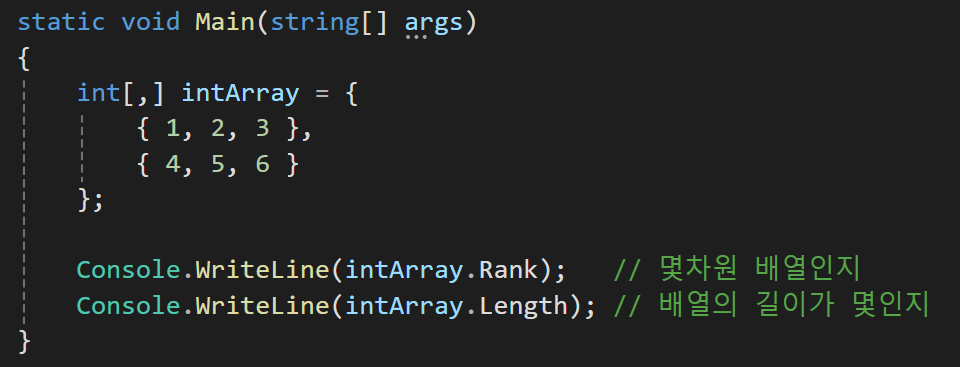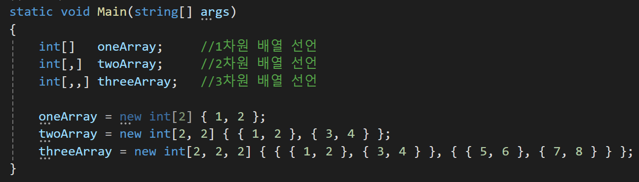 데이터타입[,,] 배열이름;  //3차원 배열 선언