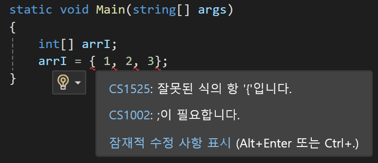 이 경우는 배열의 선언과 동시에만 가능하다.