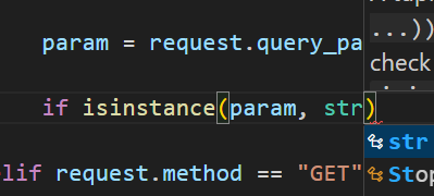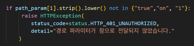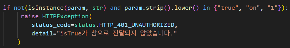 그게 아니라면 두번째 요소의 파라미터의 값이 True인지를 확인하는데 이때도 쿼리스트링을 했을 때 처럼 조건을 넣어서 확인을 해주는데 이때는 무조건 문자열로 오기 때문에 str인지는 확인하지 않고 not in을 사용해서 값을 확인해주고