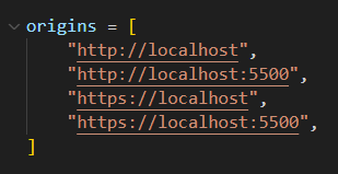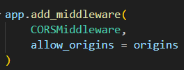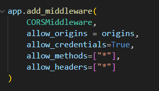 allow_origins에 origins를 넣어줘서 CORS를 허가할 도메인을 추가해주고