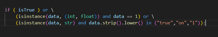 우리가 허용할 값은 True, true에 대해서 실제 bool값인 경우를 확인해야하고, 1일 경우 int 혹은 float 값인지를 확인해야하고 , 1, on, On, True인 string 값에 대해서도 확인해야 한다