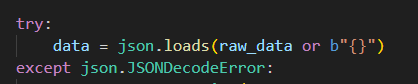 여기서 하나 추가해준다면 raw_data에 아무런 값이 오지 않을 경우를 대비해서 raw_data 뒤에 or b"{}" 를 넣어주면