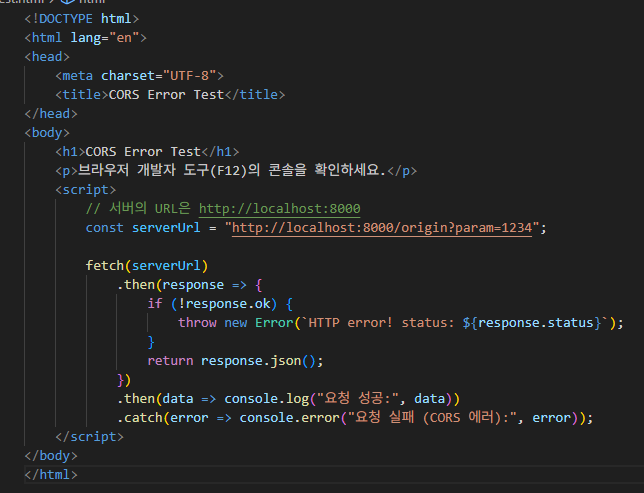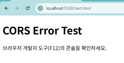 이제 이렇게 설정한 다음에 CORS를 테스트하기 위해서 HTML에서 요청을 보내는 파일을 하나 생성하고
