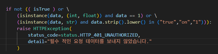 그리고 이제 data에 담긴 값중 isTrue를 꺼내서 그 값이 Fasle인지 True인지 확인해주는 조건절을 만들어야하는데 body에서 들어오는 값의 경우는 타입에 대해서도 측정을 하기 때문에 이제 모든 조건에 대해서 조건을 걸어줘야 한다
