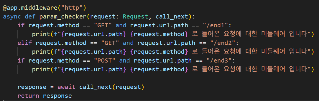 call_next함수는 다음단계(다음 미들웨어 체인 + 실제 라우트 핸들러)로 요청을 넘겨 응답을 만들어오는 비동기 함수로 FastAPI의 미들웨어 함수의 두번째 인자로 항상 주입한다.