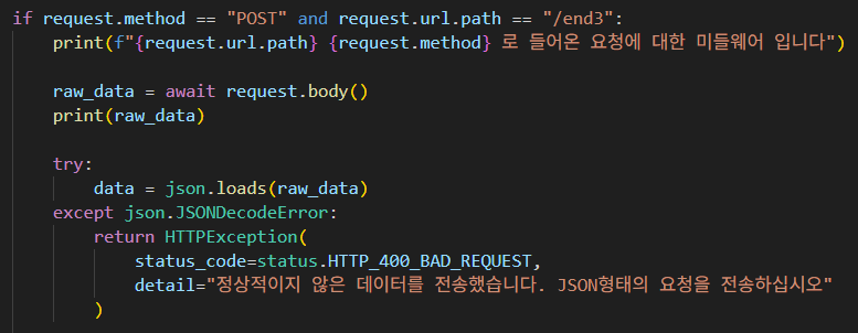 이제 이 데이터를 사용하기 편한 상태로 변경해줄 건데 이때 데이터가 정상적으로 들어오지 않을 가성성이 있기에 try-except으로 감싸주고 json.load()를 사용해서 body 데이터를 딕셔너리 형태로 변경해주자.