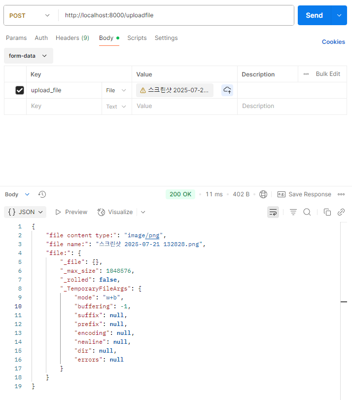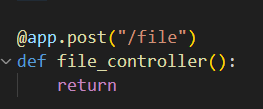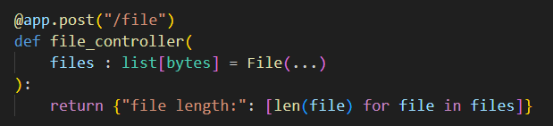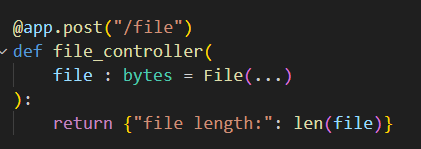 이제 파라미터에 file이란 이름으로 bytes타입으로 데이터를 받는데 File()을 넣어서 Multipart/form-data에서 file을 읽어오라고 설정해주자.