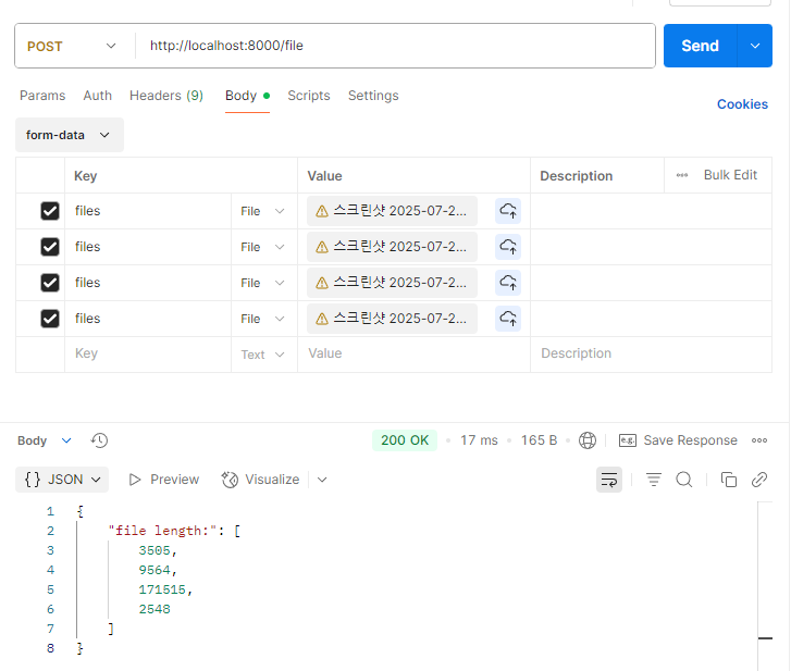 각 File과 UploadFile로 확인해보자면 먼저 File의 경우는 리스트로 타입을 넣어주고 데이터만 for-in으로 list로 뽑아주면 된다.