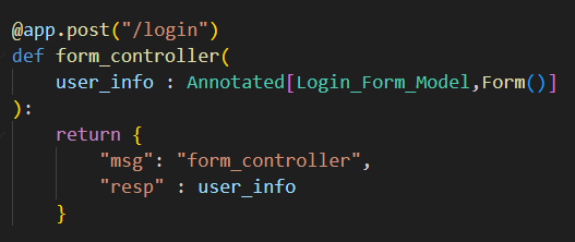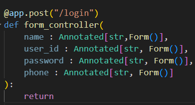 먼저 Form은 fastapi 내부에 존재하며 요청을 받았을때 어디서 값을 읽어야할지 지정해줘야하기 때문에 typing에서 Annotated를 추가해줘야 한다.