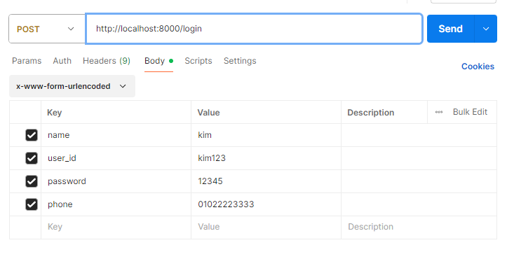 데이터를 전송할 타입을 설정하고 (form-data 혹은 x-www-form-urlencoded)