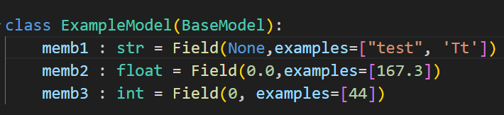 이렇게 모델이 선언되어 있을때 model_config의 값으로 json_schema_extra의 값에 example값을 넣고 그 내부에 예시가 될만한 형태의 값을 넣어주면 된다