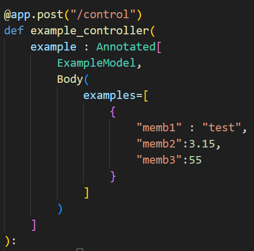 body에는 openapi_examples라는 요소로 값을 넣을 수 있는데 예시를 한번 보면서 확인해보도록 하자.