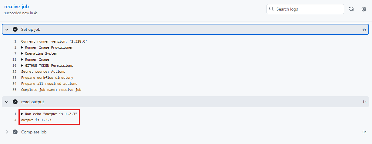 그리고 그렇게 외부로 노출된 output은 다음 Job에서 이전 Job에 대한 needs로 의존을 만든 후에 needs.[job-id].outputs.[key]로 output을 가져올 수 있다.