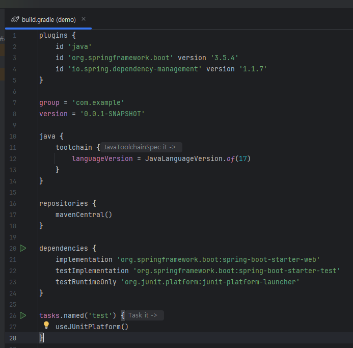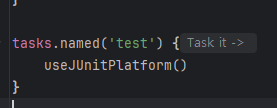 여기서 test라는 이름의 task는 JUnit Platform이라는 기술을 사용해서 진행하겠다는 의미이다.
